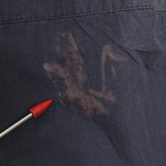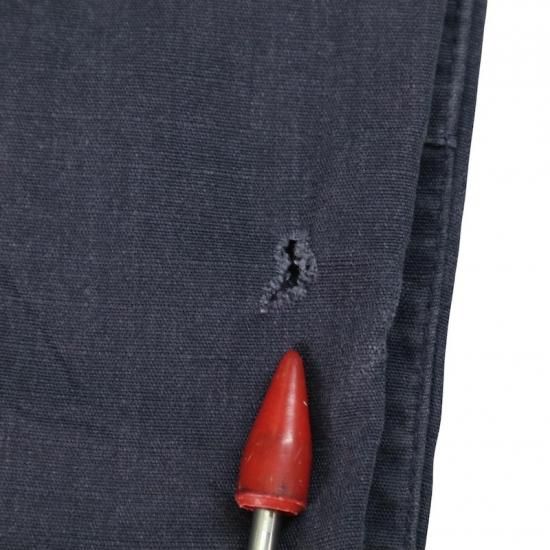 数ヶ所に汚れと擦れ、両裾口にダメージ、右裾に小さな穴がございます。着用に問題はございません。