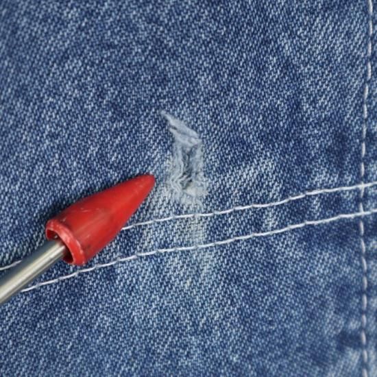 数ヶ所に薄い汚れと擦れ、後ろ右ポケットにごくわずかな小さな穴がございます。ストラップには金具が無くボタンホールが自作してあるようです。着用に問題はございません。